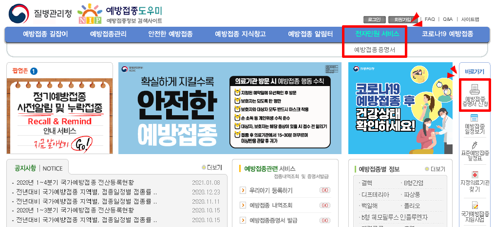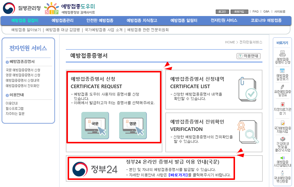 젤 오른쪽에 바로가기메뉴를 보시면 예방접종 증명서 신청이라는 란이 보입니다.
