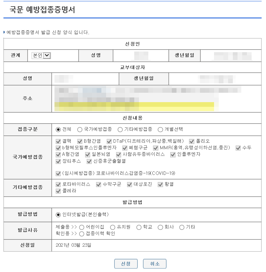 신청하기를 누르면 본인일 경우 본인의 정보가 보이며, 자녀일 경우 자녀의 기본 정보가 보입니다. 여기서 필요한 접종 종류를 선택을 하면 되는데요. 대부분 자녀들의 경우 연령에 맞게 접종을 했는지가 중요하기 때문에 모든 정보를 선택하고 신청을 하는 것이 좋습니다.