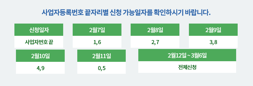 온라인 신청은 신청 첫 5일간은 사업자등록번호 끝자리를 확인하시어 해당되는날 신청하시면 됩니다.