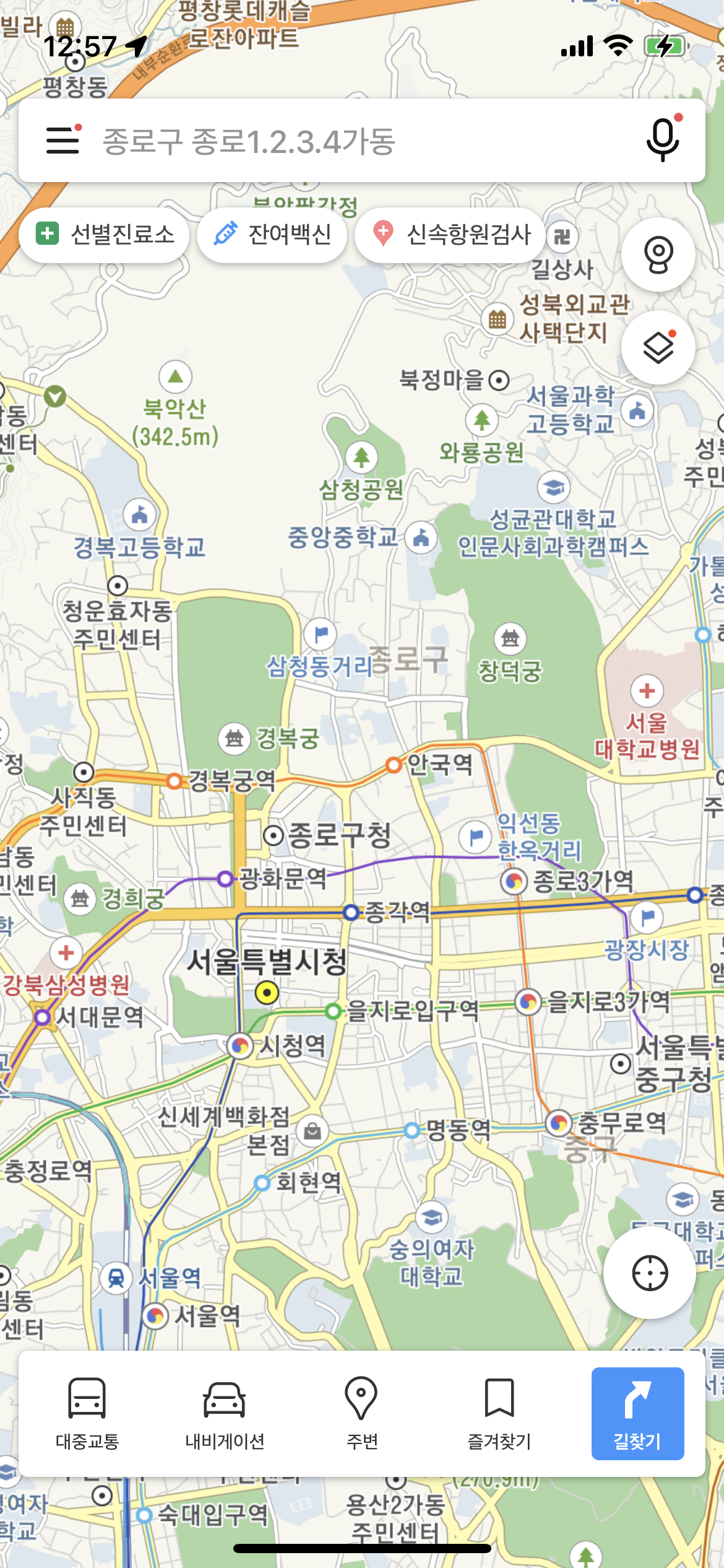카카오맵도 네이버지도와 마찬가지로 지도의 형태만 조금 다를뿐 검색창 아래에 보시면 선별진료소 , 잔여백신, 신속항원검사 란이 보입니다. 클릭해서 들어가면 가까운 곳에서 있는 선별진료소와 신속항원검사소를 찾아볼 수 있습니다.