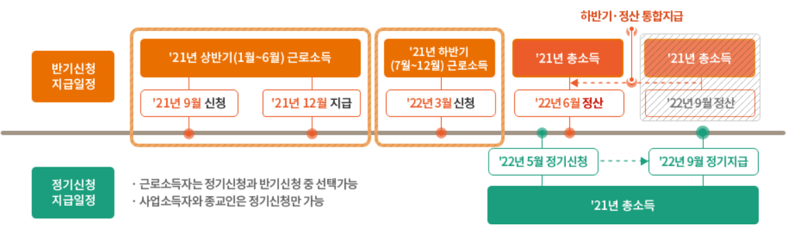 21년 상반기분에 대해서는 이미 신청 및 지급이 끝났고, 21년 하반기 분은 2022년 3월 1일부터 3월 15일 까지 신청할수 있고, 지급일은 2022년 6월 말입니다.