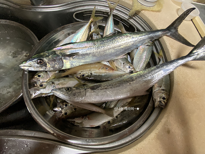역시나 삼치 군단이 들어왔었나 봐요. 저는 못 잡았지만 저희 일행 중에 삼치를 2마리나 낚았답니다. 삼치 치고는 아주 큰 편은 아니었지만, 마트에서 볼법한 사이즈였답니다.