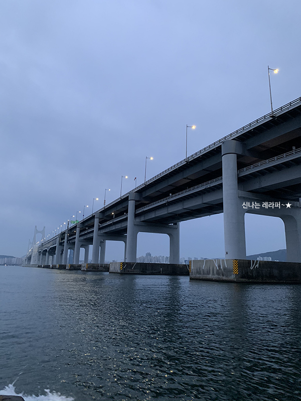 교각 사이를 왔다 갔다 하면서 광안대교를 지그재그로 왔다갔다 몇 번 했어요. 탁 트인 바다를 보니 마음도 시원해지고, 머릿속도 맑아지는 느낌이었네요. 일찍 일어나야 하지만, 이런 느낌은 정말 좋은 것 같습니다.