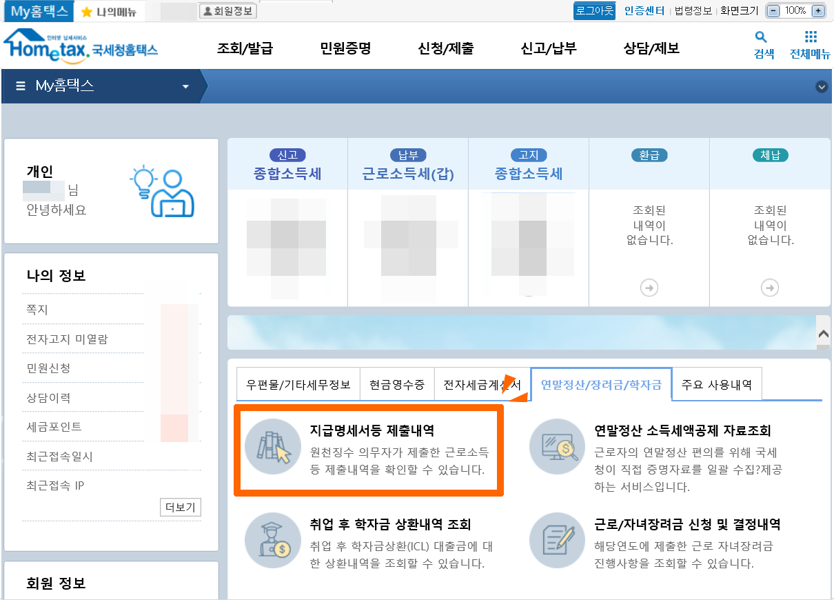 예전과 다르게 화면이 조금 바뀌었는데요. 연말 정산/장려금/학자금 란을 클릭합니다.