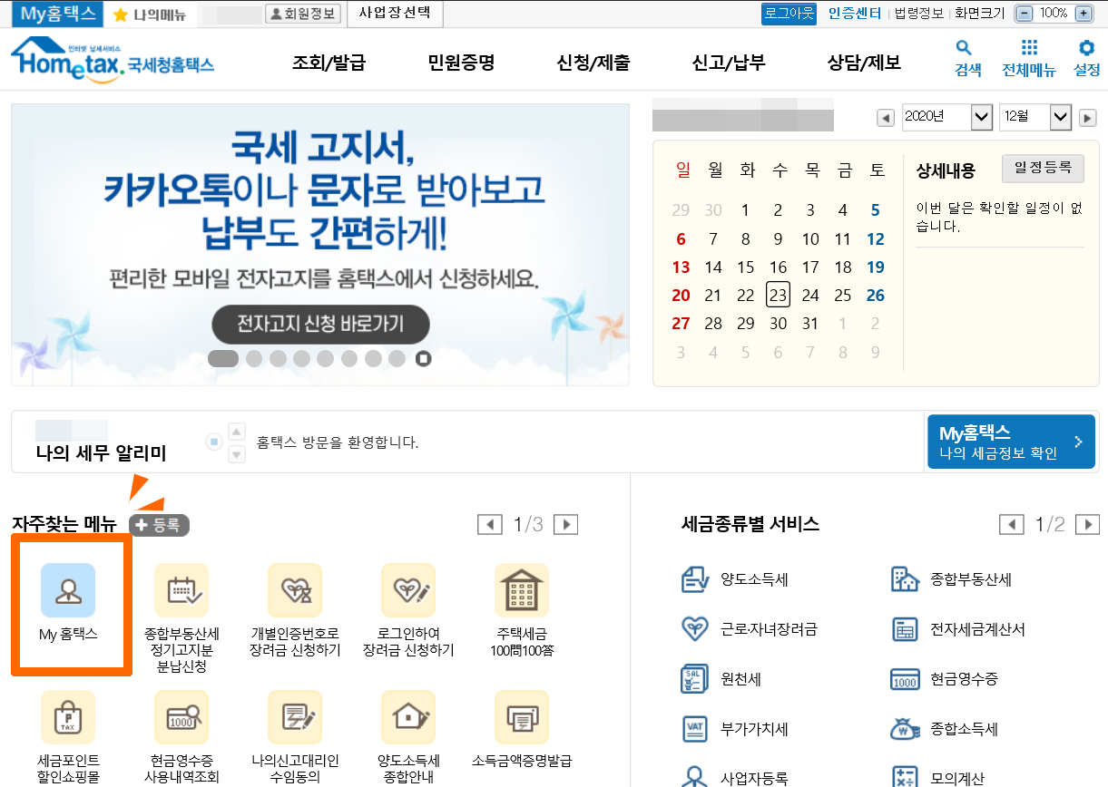 로그인하여서 MY홈택스 란을 클릭을 합니다.