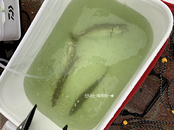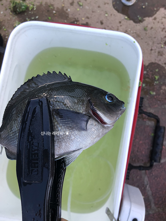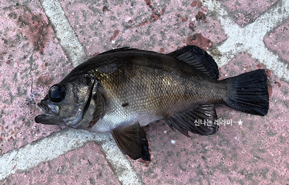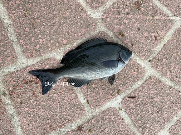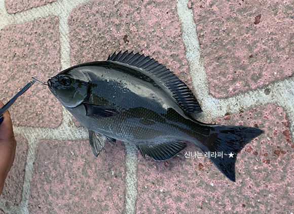 몸도 매끈하고 지느러미까지 적당한 라인을 가지고 있다고 생각했어요~ 하지만, 크기가 그렇게 크지 않아서 바로 방생을 했는데요. 나중에 사진을 자세히 보니 아가미 부분에 검은 줄무늬가 있는 것을 보니 '긴꼬리 벵에돔'이었어요.
