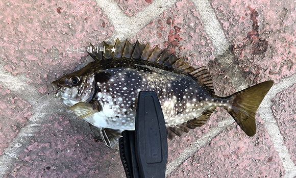 벵에돔을 잡기전에 이런 녀석도 한마리 잡았는데요. 따치라고 하는 독가시치 입니다. 지느러미가 뾰족하고 찔리면 매우 아프기 때문에 조심해야한다고 합니다. 원래는 아열대 물고기라서 제주도 등지에서만 잡히던 녀석인데, 점점 더워지는 날씨때문에 남해안에서도 종종 잡힌다고 하네요.