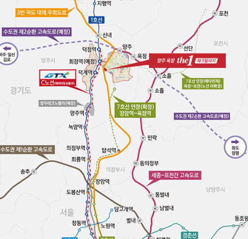 지하철 7호선의 연장선이 옥정역이 들어서면 서울까지 단 세정거장이면 이동이 가능합니다. 그리고 가까이에 화정역이 신설 예정이라 GTX를 이용할 경우 역시 서울까지 매우 빠른시간에 도달할수있습니다.