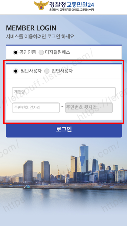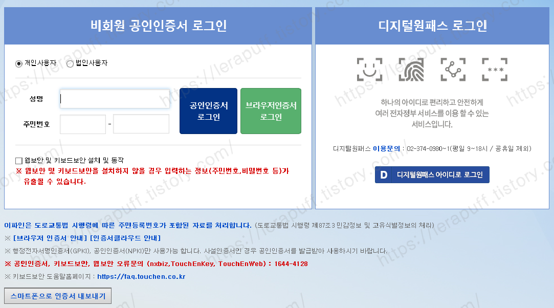 그러면 로그인 화면이 뜨는데요. 이름과 주민등록번호를 넣고, 공인인증서나 디지털원 패스를 통해서 본인인증을 하게 되면 내역을 조회할 수 있습니다. 아주 간단하게 휴대폰으로도 조회가 가능합니다.