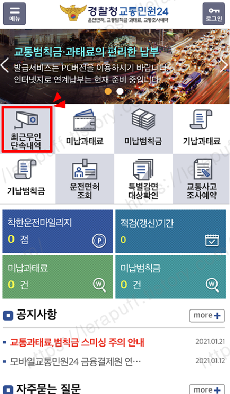 사용방법은 간단하게 PC와 같습니다. 앱으로 접속을 해서 최근 무인단속내역을 클릭을 합니다.