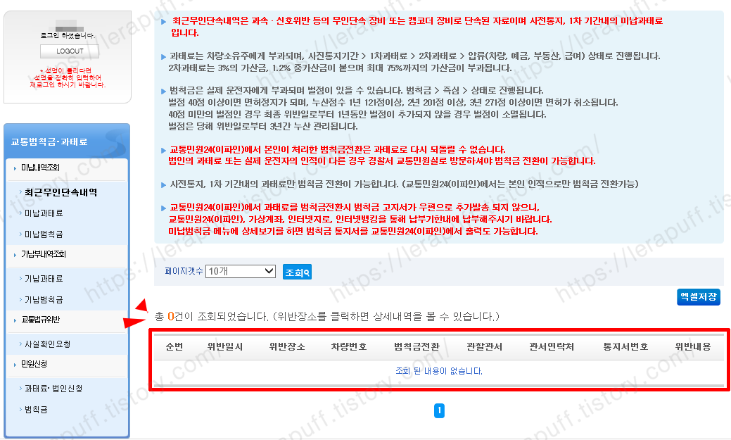 로그인을 하자 왼쪽 화면에 로그인하셨습니다라는 문구가 뜹니다. 별다른 인증서 등록절차 없이 바로 로그인되니 간편하네요. 속도위반이나 신호위반의 사항이 없을 경우 아래와 같이 조회된 내용이 없습니다. 라고 조회가 됩니다. 그럼 안심하셔도 될 것 같습니다.
