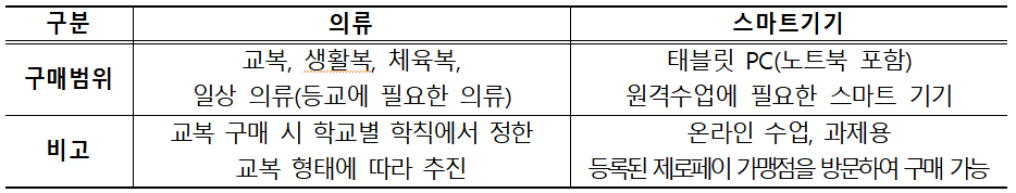 지급방식은 각 학교에서 학생의 신청을 받아서 교복구매 지원또는 제로페이 모바일포인트를 지급하는 방식을 지원이 된다고 합니다. 구입할수있는 범위는 교복, 생활복, 체육복, 일상의류(등교에 필요한 의류) 그리고 원격수업시 필요한 스마트기기 등입니다. 대상인원은 2월 중으로 신청을 받고, 1인당 30만원씩을 지원할 계획입니다.