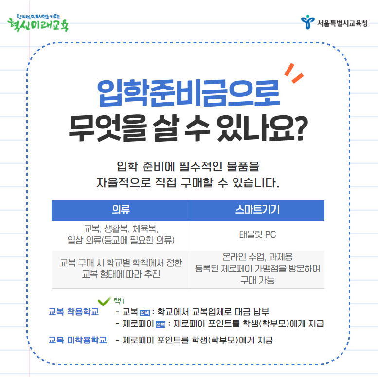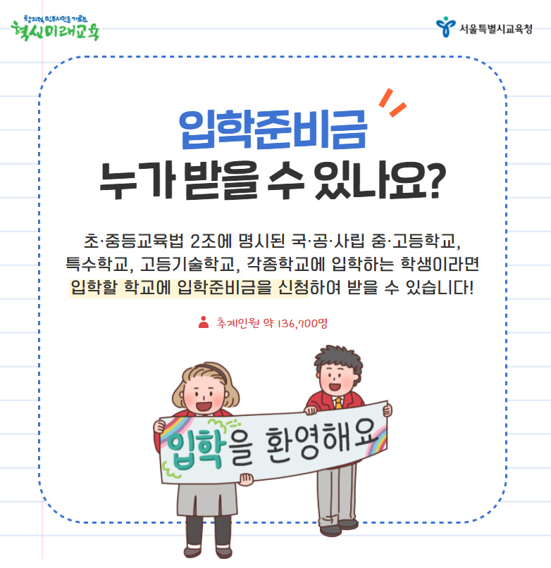 이는 전국 최초이며, 서울 모든 자치구와 교육청과 협력하여서 국,공,사립 중,고, 특수, 각종학교에 입한하는 학생을 대상으로 지원을 합니다. 기존에는 입학준비금대신 무상교복 정책으로 시행이 되었었는데요. 현재 교복자율학교도 있고, 편안한 교복정책에 따른 학교와 학생에게는 차별적인 정책이므로 이를 개선하기 위해서 시행되는 것입니다. 제일 큰것은 신입생 가정의 경제적 부담을 감소시키는데 있으며 보편적 복지 실현에 있다고 합니다.