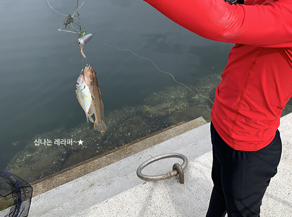 저희 아들들은 원투낚시를 좋아해서 멀리 던져서 물고기를 노려봤고요. 저는 그냥 민장대로 찌낚시를 했답니다. 원투를 하던 막내는 일타쌍피로 물고기 두 종류를 낚기도 했어요~ 하나는 망둥이 같기도 하고, 하나는 주둥치네요~ 요즘에는 거제도에서도 주둥치가 많이 올라오는 것 같아요. 머리에 점이 있는 것이 특색이고, 지느러미가 살짝 노란 빛을 띄고 있어요. 사실 이름을 몰라서 열심히 검색 후에 찾은 거랍니다.