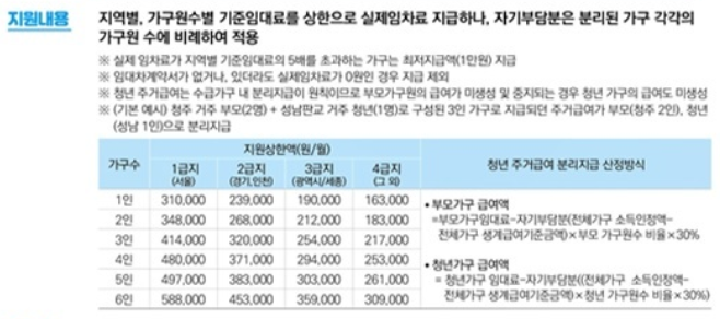 지역별, 가구원수별로 지원금은 상한액이 정해져 있습니다. 청년 주거급여 분리지급 산정방식에 따르며 자세한 금액은 아래의 표와 같습니다.