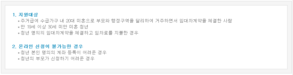 지원 대상으로는 주거급여를 이미 받고있는 가구 내 20대 청년으로 미혼일 경우 가능하며, 부모와 행정구역을 달리하여 거주하고 있으며, 임대차 계약을 체결한 사람의 경우 신청이 가능합니다. 나이는 만 19세 이상에서 만 30세 미만읜 미혼 청년입니다.