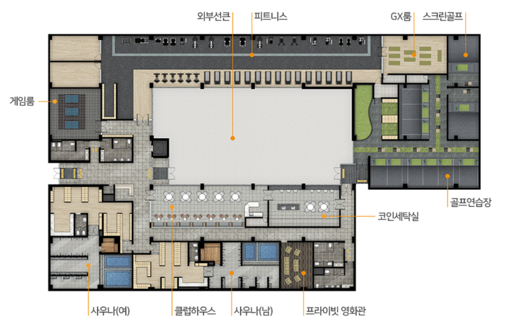 클럽하우스, 피트니스, GX룸, 스크린 골프 등 다양한 운동시설과 프라이빗 영화관, 동호회실, 프라이빗 오피스, 도서관, 북카페, 독서실 등의 문화시설 또한 넉넉히 계획되어있습니다.