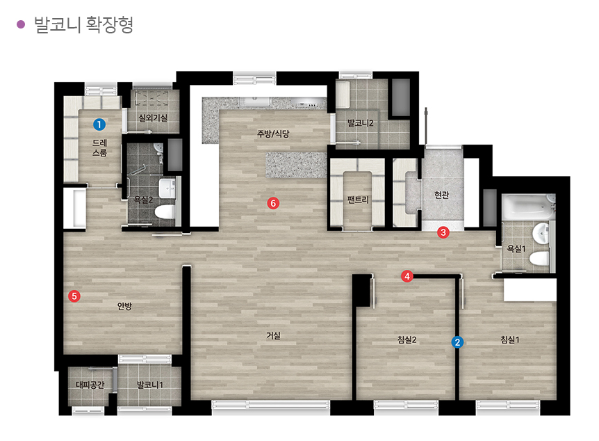 84A역시 4 bay이며, 주방의 많은 수납공간과 넓은 팬트리, 드레스룸이 특징입니다. 발코니 확장하여 사용할 경우 양쪽의 공간을 모두 활용하여서 보다 넓은 공간으로 활용이 가능합니다.