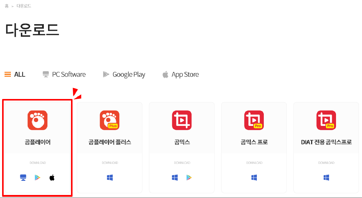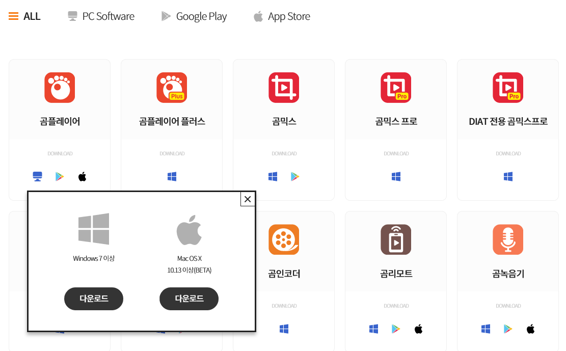 여러 가지 프로그램이 보이는데요. 곰플레이어를 다운로드하기 때문에 곰플레이어를 클릭을 하면 됩니다. PC버전과 모바일 버전인 구글플레이어와 애플스토어 아이콘이 보입니다.