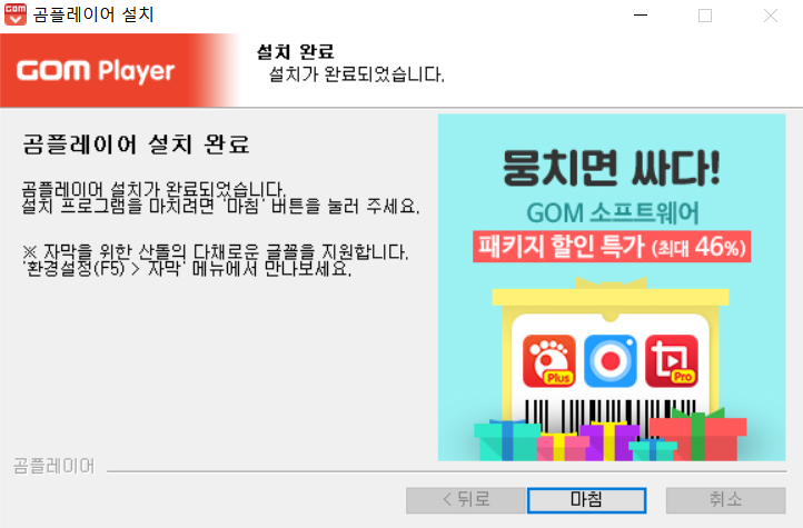 설치가 완료되면 다음과 같이 설치 완료 화면이 뜹니다. 마침을 누르자 다른 제품을 추가로 설치할 것인지 묻는 창이 뜹니다. 필요에 따라서 곰오디오와 곰 믹스 프로 등을 설치하시면 되고, 필요가 없을 경우 취소를 누르면 됩니다.