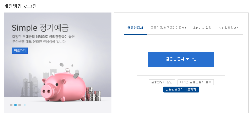 부산은행 홈페이지에 접속을 하면 아래와 같은 화면이 제일 먼저 뜨는데요. 로그인을 이용해야지 인터넷 뱅킹을 이용할 수 있습니다. 로그인을 하기 위해서는 인증서가 필요로 한데요. 인증서를 클릭을 하면 개인인지 기업인지 선택을 해야 합니다. 개인 인터넷 뱅킹을 이용하실 경우 개인을 선택하시고, 기업 인터넷 뱅킹을 이용하실 경우 기업을 선택을 합니다.