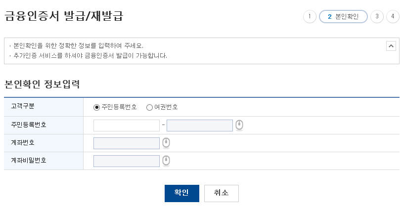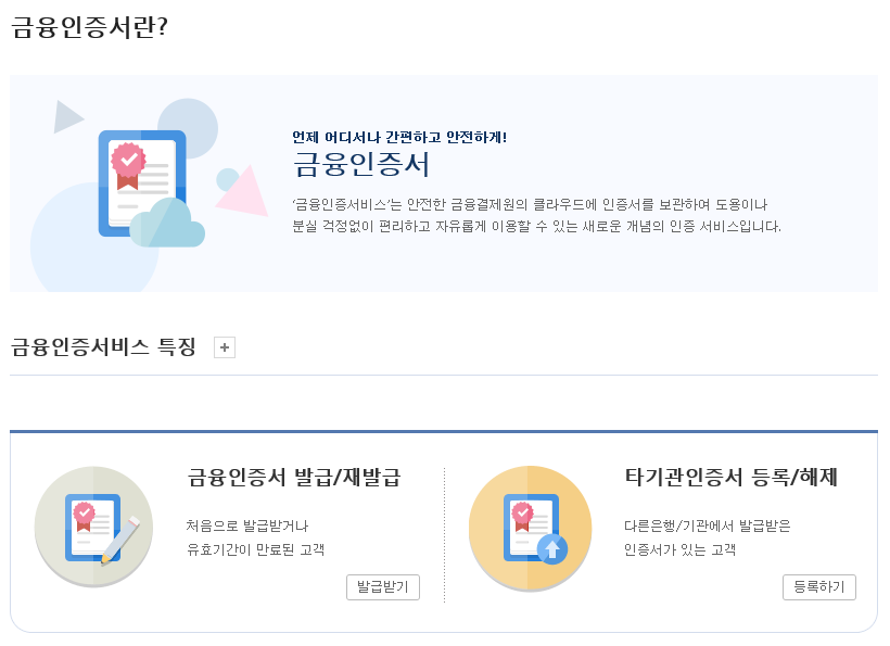 기존 공인인증서가 없을 경우 금융인증서를 발급을 받으면 되는데요. 금융인증서를 발급받아보도록 하겠습니다.
